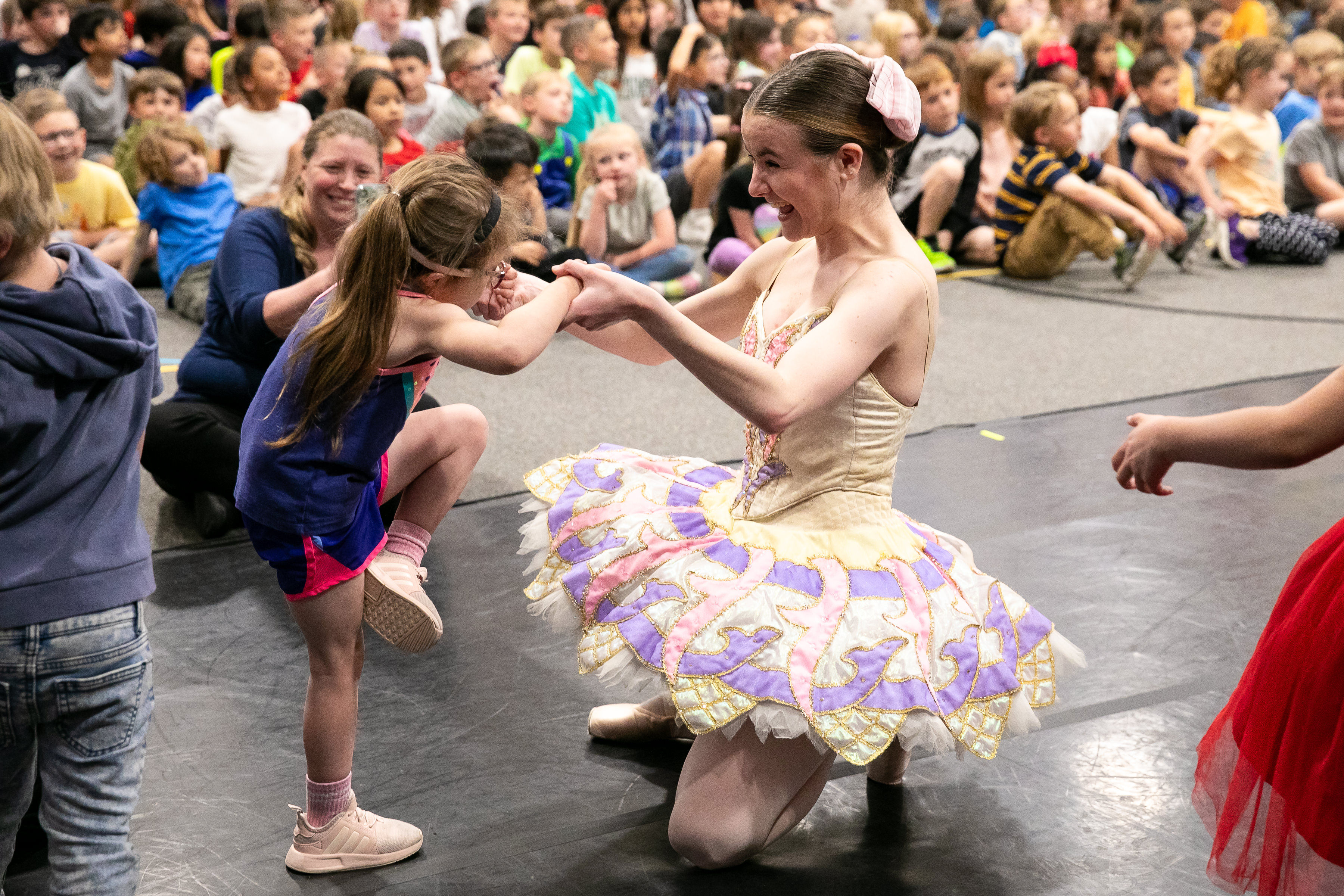 From the Page to the Stage is a 45-60 minute assembly that happens at your site. We challenge you to fill the space (cafeteria, gym, etc.) with as many people as possible to experience the beauty of ballet.
